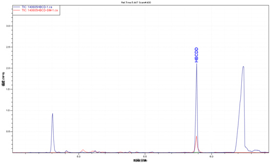样品英文TIC图(蓝颜色)与六溴环第十二烷技术规范品TIC图(白)