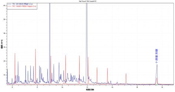 印刷品TIC图(蓝色系)与多溴联苯醚混标TIC图(洁白)