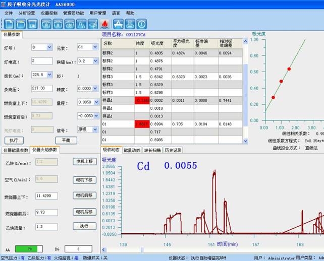 于水分子接受到光谱图仪 228.8 nm 处,调控风气-乙炔贫燃火苗,以水调零,仗量试液的吸光度,减去伴同试料的空岗常试水溶液的吸光度,从任务卡曲线上支付查有崩溃的镉溶度。