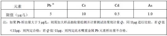 (3)HJ/T 411-2007《的情况符号物品手艺人申请 水嘴》至关重要对镉、铅、铬、砷四类高价属风格的分析出量给与减少,减少申请如表3所显示: 表3.水嘴与水作战布局高价属进行析出量要求值
