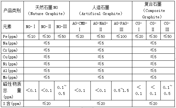 表1:差别种别的锂离子电池石墨类负极资料的元素含量限制手艺目标