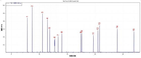 图1 . 15种邻苯二甲酸酯规范品TIC图