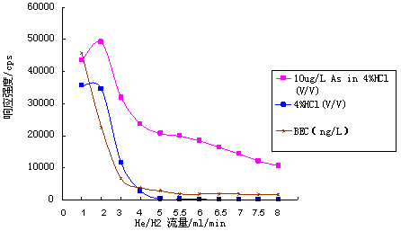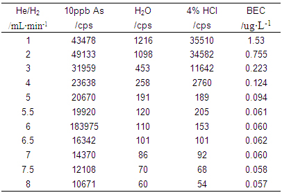 仪器起首在规范形式下停止参数优化(操纵10μg·L-1的Li、Co、In、U、Ce调谐液对仪器任务参数停止调理,使仪器活络度高,同时氧化物及双电荷产率小于3%);再开启He/H2碰撞反映气,慢慢增大He/H2流量,测试超纯水、4%HCl及10μg·L-1 As(4%HCl介质)在75amu处的呼应旌旗灯号,计较其背景等效浓度(具体数据见表1及图1)﷽;并操纵As标液进一步优化He/H2流量,获得仪器任务参数如表2所示。