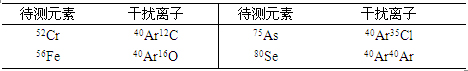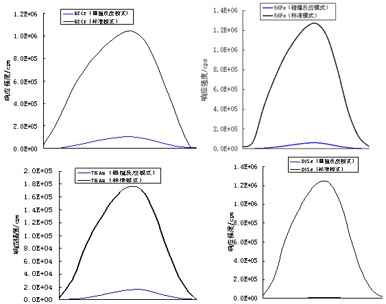 今朝四极杆电感耦合等离子体质谱仪多接纳氩气等离子气,则氩原子与基体离子连系构成多原子离子,看待测元素同位素形成搅扰,具体搅扰见表3。设置装备摆设10μg·L-1的Cr(3%HAc介质)、Fe(1%HNO3介质)、As(4%HCl介质)、Se(1%HNO3介质)规范溶液,别离在规范形式及碰撞反映形式下测定其同位素呼应旌旗灯号(图2),尝试成果同时显现56Fe与57Fe呼应强度靠近Fe同位素品貌比,52Cr与53Cr呼应强度靠近Cr同位素品貌比(57As及80Se无适合参考同位素), 由上述可知,ICP-MS 2000E接纳He/H2作为碰撞反映气体,能有用去除氩基相干多原ꦓ子离子搅扰。