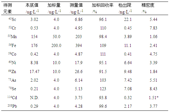 在仪器优化任务参数前提下,对样品溶液及加标样液停止测试,计较其加标收受接管率;对样品空缺溶液平行测定7次,以三倍空缺旌旗灯号规范误差/活络度对应的浓度为检出限;同时对样品溶液平行测定11次(距离2min),计较其绝对规范误差,考查精密度,数据见表4。各元素检出限在0.41-22.07ng/L之间,加标收受接管率在93.82%-123.10%之间,精密度在1.06%-🐓8.43%之间。